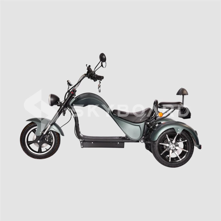 Электроскутер SKYBOARD TRIKE CHOPPER-4000 PRO FAST – мощный и эксклюзивный, первое, что приходит на ум при визуальном ознакомлении с техникой. Изогнутая рама, брутальный дизайн наталкивают на мысли о максимальных скоростях и непередаваемых ощущениях. Со слов производителя предчувствие клиентов является правильным.