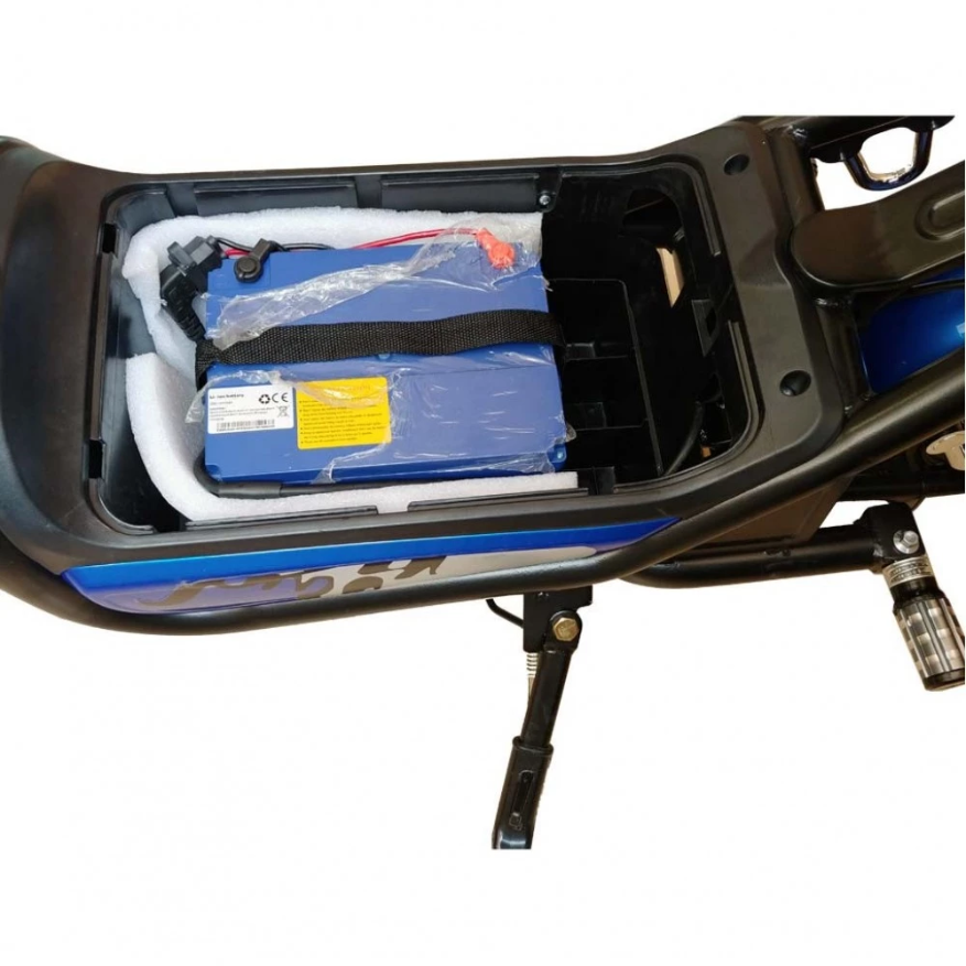 Удобное сидение с возможностью установки дополнительного делают поездки еще более комфортными. Бесколлекторный движок (500 Вт) при максимальной нагрузке в 150 кг с легкостью выдает 35 км/час. Батарея Lilon надежно зафиксирована под рамой для экономии полезного пространства. Емкость (20 Ач напряжение 48 В) АКБ позволяет пройти до 50 км на одном заряде. Дуэт из дисковых и барабанных механических тормозов обеспечивают полную защиту райдера на дороге. Вилка оборудована подвеской на амортизаторах для смягчения наезда на ямы и кочки. Малогабаритные размеры (1550*620*1050 см) и малый вес модели (55 кг) дает возможность пользователю прекрасно маневрировать в плотном городском потоке. Стальная рама имеет особую прочность материала. Корзинка на руле надежно закреплена и имеет хорошую вместительность. Райдер может совершать покупки и перевозить грузы с большим комфортом.