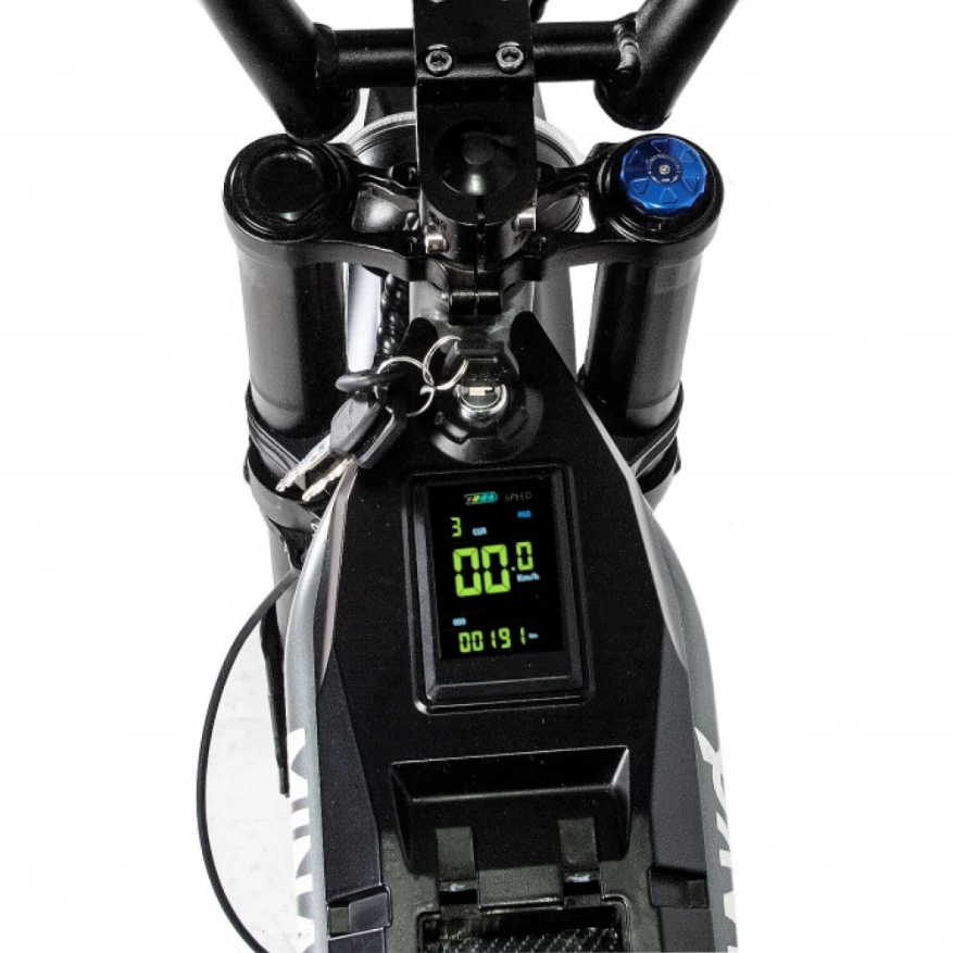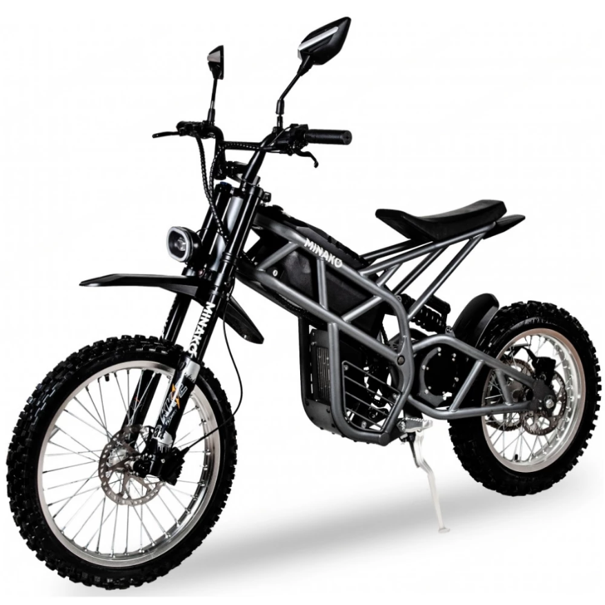 Электроскутер Minako CROSS в черном цвете визуально напоминает крутую технику, современный мопед. Привлекает внимание большая светодиодная фара и мощная рама. Дизайн подчеркивает лучшие технические характеристики. Купить электровелосипед на выгодных условиях, остаться довольными приобретением предлагает наш интернет-магазин. Техника оснащена мощным мотором на 3000 Вт, способными выжимать скорость до 100 км/час. Наличие педалей допускает езду в смешанном режиме. Емкости батареи (20000МАч) достаточно на преодоление дистанции до 100 км. Батарея размещена на раме, в защитном боксе, исключающим повреждение АКБ. С такими параметрами потребуется покупка защитных аксессуаров для ездоков. Колеса с агрессивным протектором обещают отличный накат и сцепляемость с разными видами покрытия. Допускает езду по ровной и пересеченной местности. Небольшое анатомическое седло, удобная рулевая часть с максимальным функционалом увеличивают уверенность райдера в собственных действиях. Информационный дисплей показывает важные для ездока параметры, исключает непредвиденные ситуации в виде разрядк