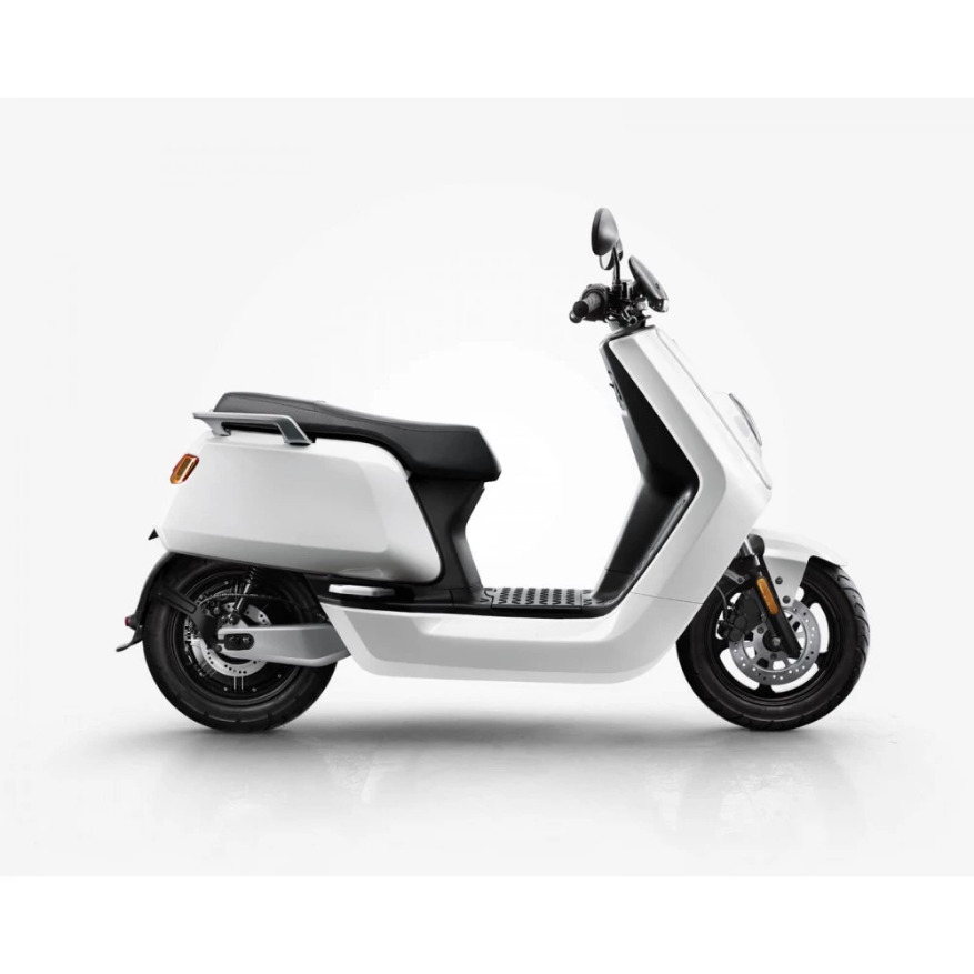 Электроскутер NIU N1 Series (Белый) - отличная модель с красивым дизайном, светодиодной оптикой, литыми дисками. На данной модели комфортно перемещаться в городском потоке благодаря правильному расположению органов управления. Для пассажира имеются удобные складывающиеся подножки, ручки и спинка. Хорошо освещенная приборная панель хорошо читается даже в солнечную погоду. На ней отображены: скорость, заряд батареи. Заявленная мощность двигателя NIU N1 Series 1500Вт, что позволяет быстро разгоняться. Съемная батарея находится под ногами водителя, заряжается она от сети 220В, время полной зарядки 3 часа. Максимальное расстояние, которое можно проехать на одном заряде - 70км. Вес такой модели составляет 57кг, грузоподъемность до 160кг. Подвеска хорошо отрабатывает небольшие неровности дороги. На центральной подножке байк стоит уверенно, что исключает возможность завала на парковке. Скутер имеет разъем USB под приборной панелью для зарядки гаджетов, под сиденьем небольшой багажник. Основные преимущества электроскутера NIU N1 Series в том, что на нём можно не стоять в пробках, он не шумит, не выделяет выхлопных газов.